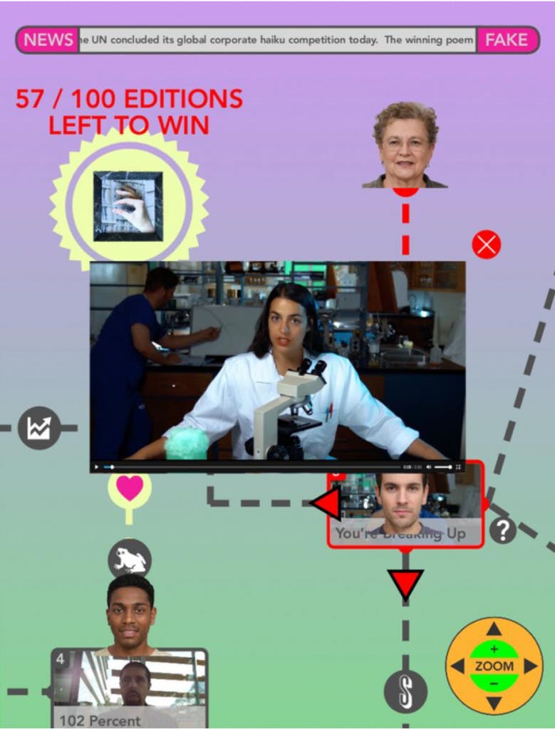 The show includes an adapted version of Beloufa’s 2020 Screen Talk Project, an interactive online page where visitors must play a game to gain access to additional content. In places where only extracts are shown, QR codes are used to provide access to full-length videos.