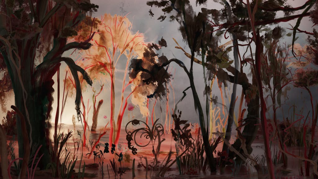 Emma Webster (USA/UK, b. 1989) is a Californian painter with an MFA from Yale School of Art (2018) and BA from Stanford University (2011). Webster exposes the history of landscape painting as scenographic farce. She recently started modeling her panoramic paintings from greenspace built in VR. By explicitly painting the environment without nature, Webster warns against human exceptionalism during the climate crisis. More at https://emmawebster.com