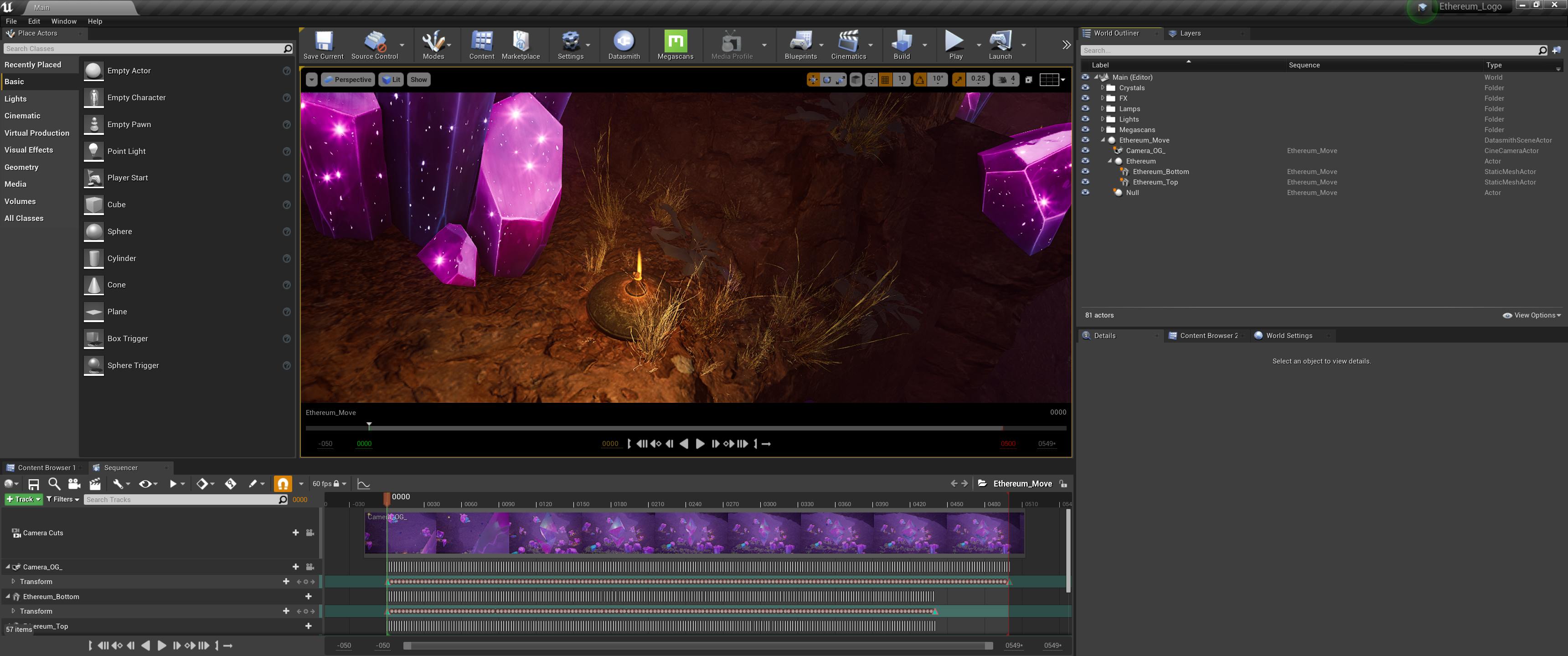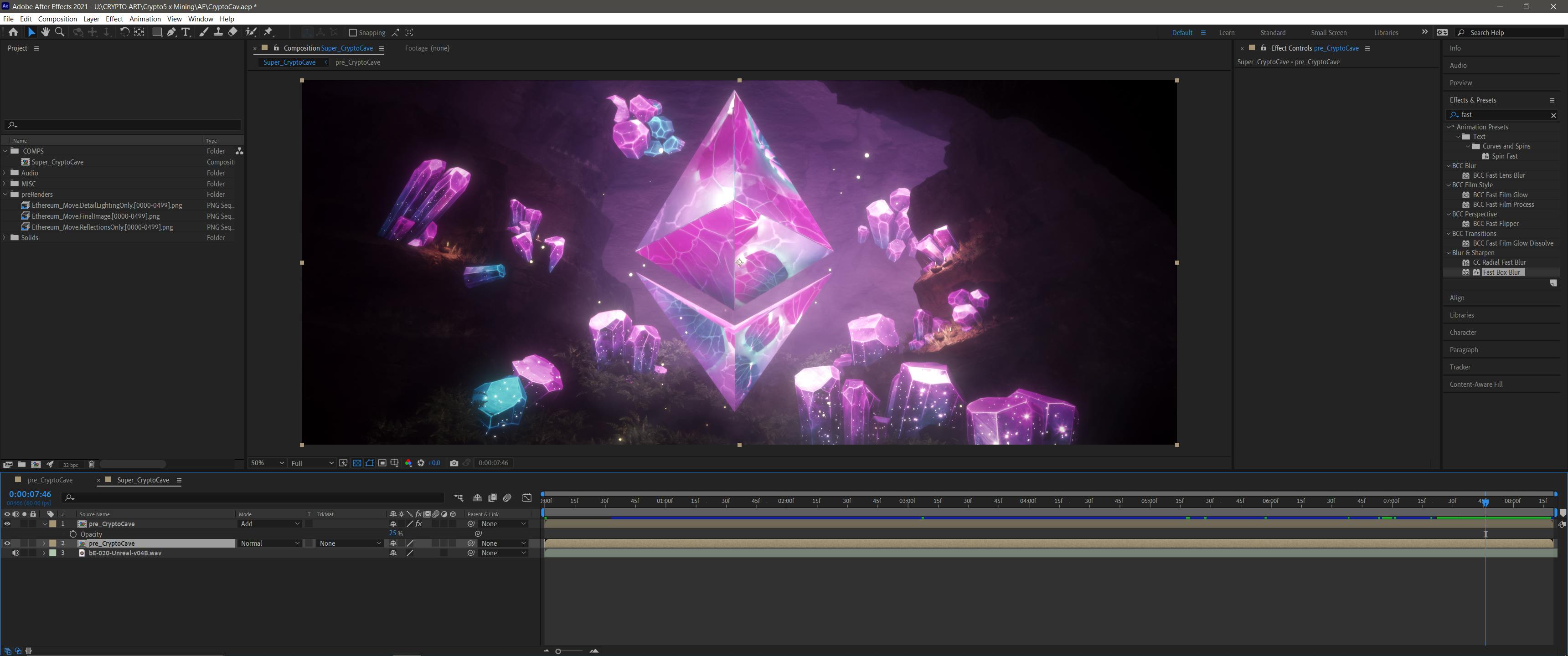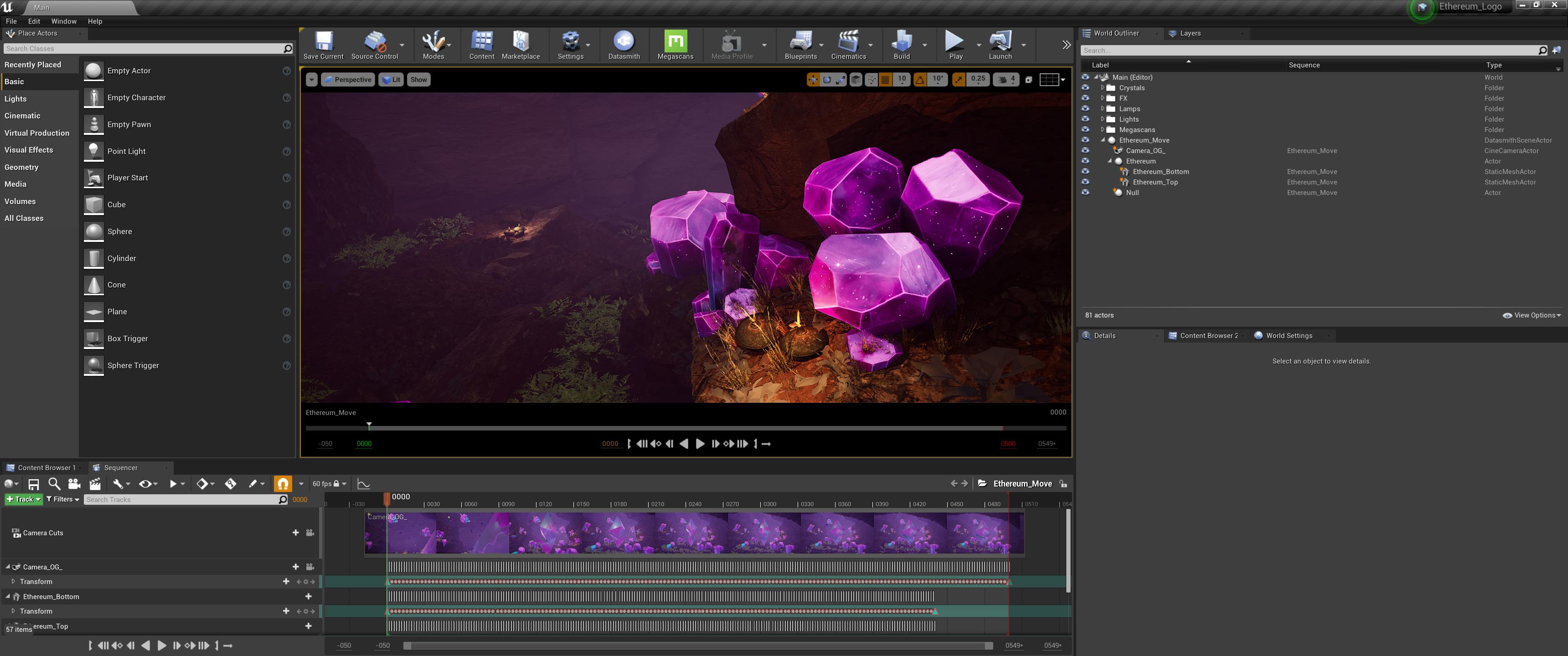 Starting in Cinema 4d the Ethereum model was created and placed in the direct center of the scene so that everything could be built later on around it since this is the hero piece of the shot. Using the camera target tag so that the camera is always looking at our hero piece the camera is placed near the crystal and then pulled back in one swift movement.