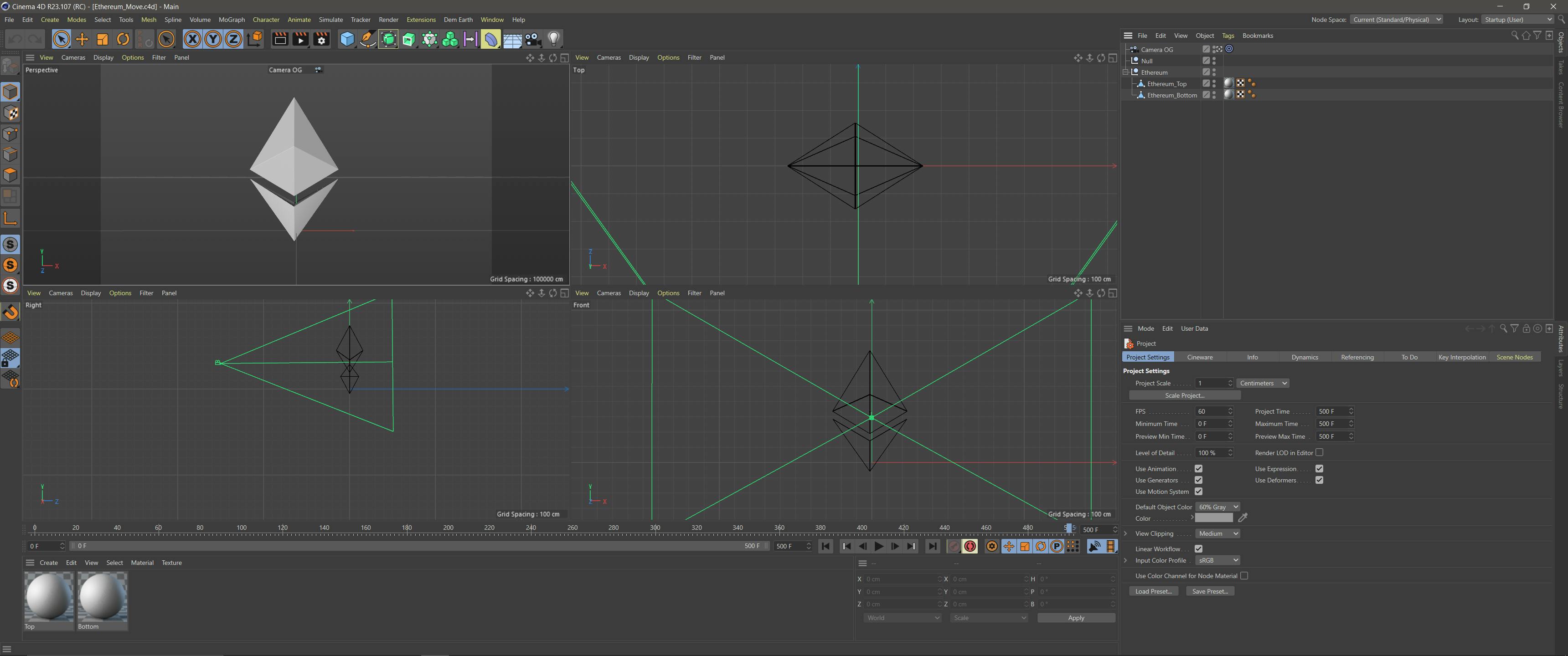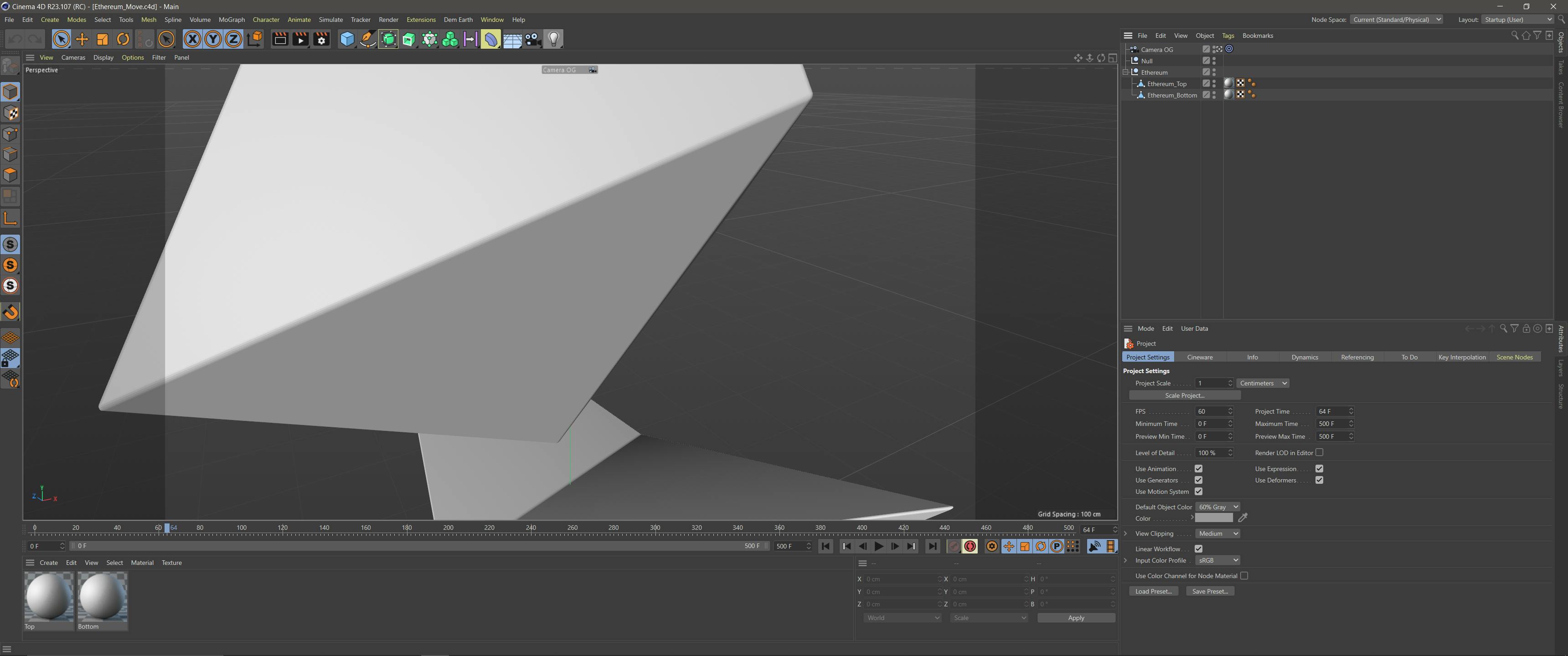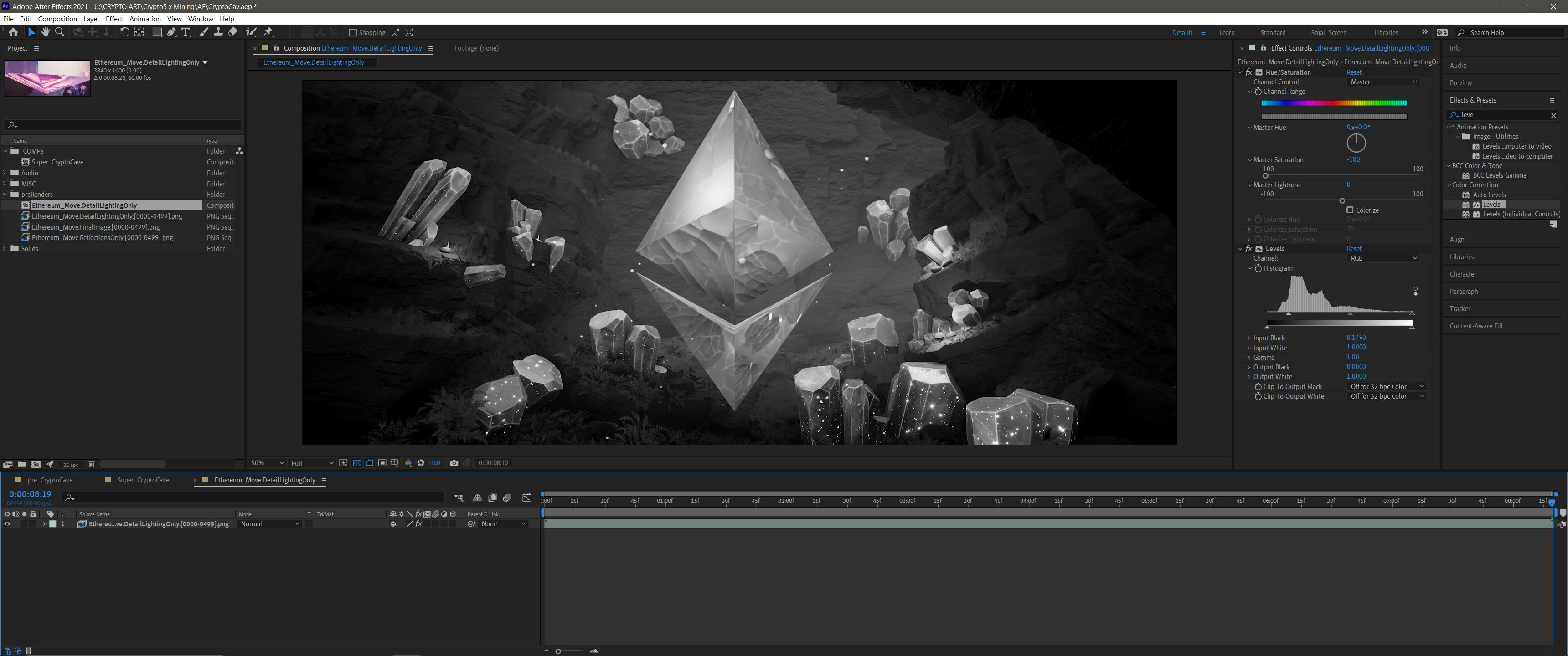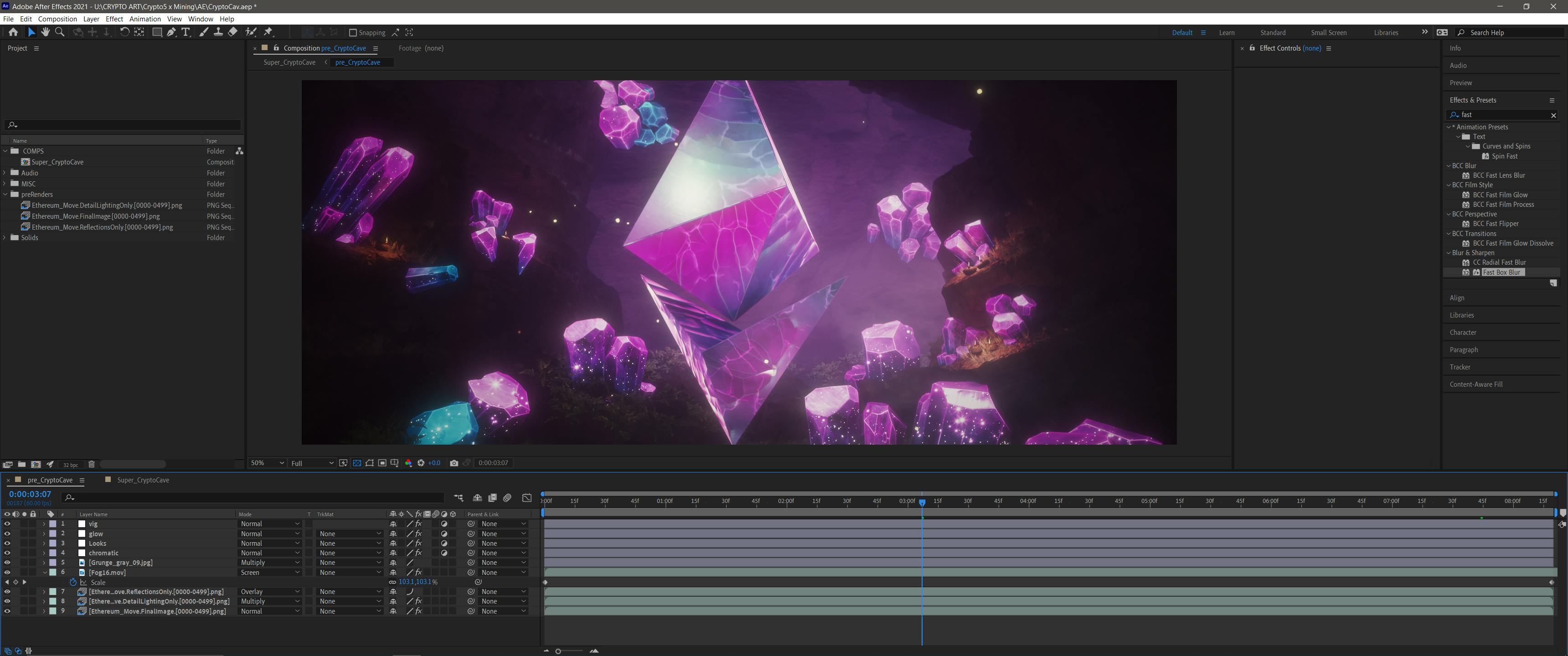 Starting in Cinema 4d the Ethereum model was created and placed in the direct center of the scene so that everything could be built later on around it since this is the hero piece of the shot. Using the camera target tag so that the camera is always looking at our hero piece the camera is placed near the crystal and then pulled back in one swift movement.