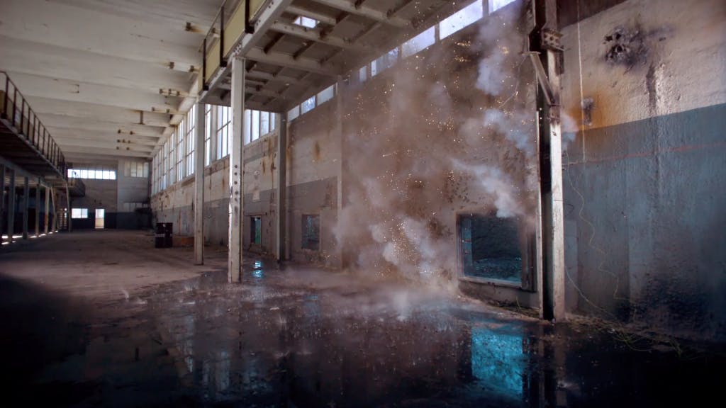 As the entire process is not only eruptive but also fast and dramatic, its result can only be truly appreciated on video. Most of these have been shot using a high-speed digital camera which enables the artist to capture the moment at a very low speed that seems to almost freeze the flying debris, creating a slow-motion poetic intensity conducive to reflection.