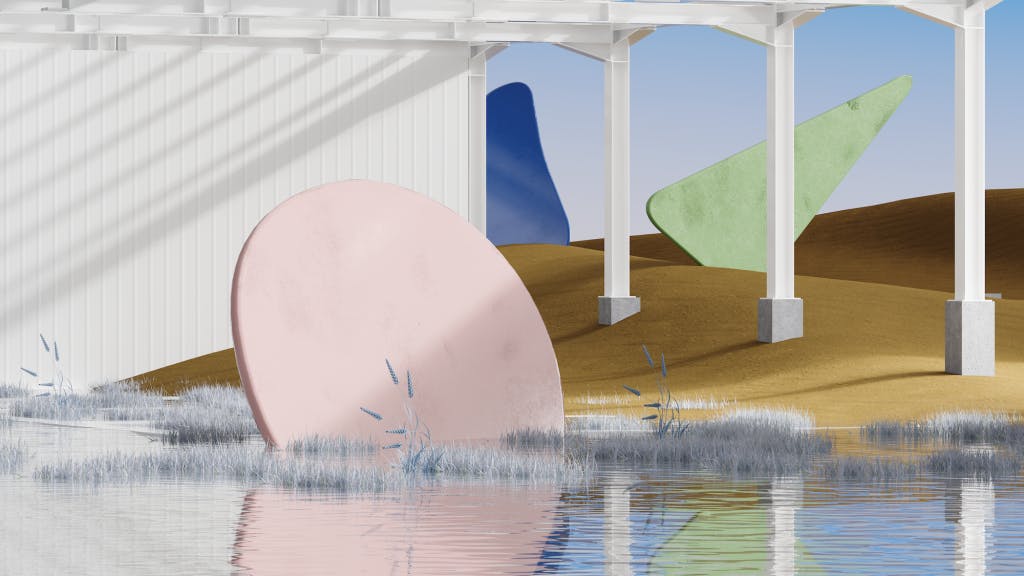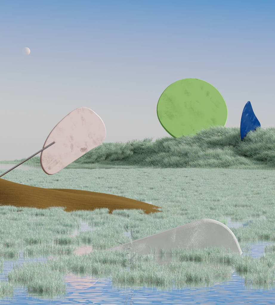 In the other two artworks “(De)Constructing Calder #1 & #2”, those mobiles have been moved to oniric landscapes, in a nameless place. In these, sizes and places have been exaggerated, looking for a place to inspire tranquility and where to find answers to real questions.