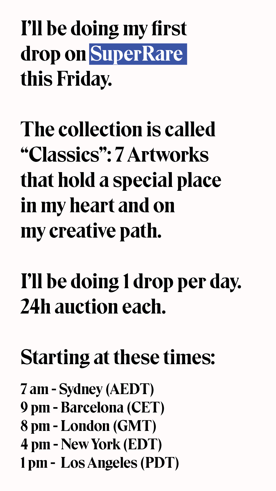 SuperRare welcomes Alex Trochut and his genesis NFT collection with open arms – a hand picked selection of 7 works that has shaped Alex’s career – he calls these his ‘classics’. Each day, one 24hr auction ends, another starts – take a look at the collection below.