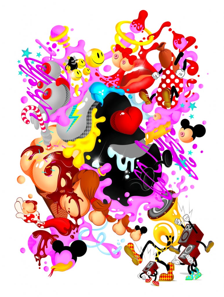 Mosquito Acid Valley is an image created for the legendary Italian parties of 2005. I was invited to take on the character created by @superexpresso and remix it into a gravity zero moment of euphoria, love, and psychedelia. At the time, I was very interested in the use of digital airbrushing in Photoshop, and combining them with fluid shapes and cartoonish surreal images.