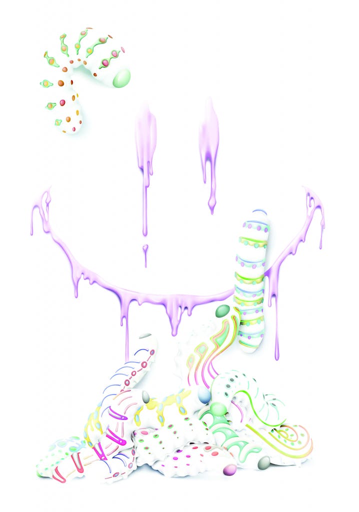 This piece continues a theme expressed in my piece Mosquito Acid Valley (2005) but this time, grabbing at the feeling of a faded chemical happiness. It pictures a pile of soft caterpillars, a representation of slow, and lethargic feeling, and worn down colors that still show some signs of glowing toxicity. The scene is framed by a slimy smiley face in the background. This image was inspired by Sacha Funke – Mango Cookie (DJ Koze Pink Moon Remix) which was in the back of my head all the time during the process of this image.