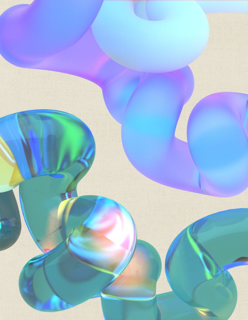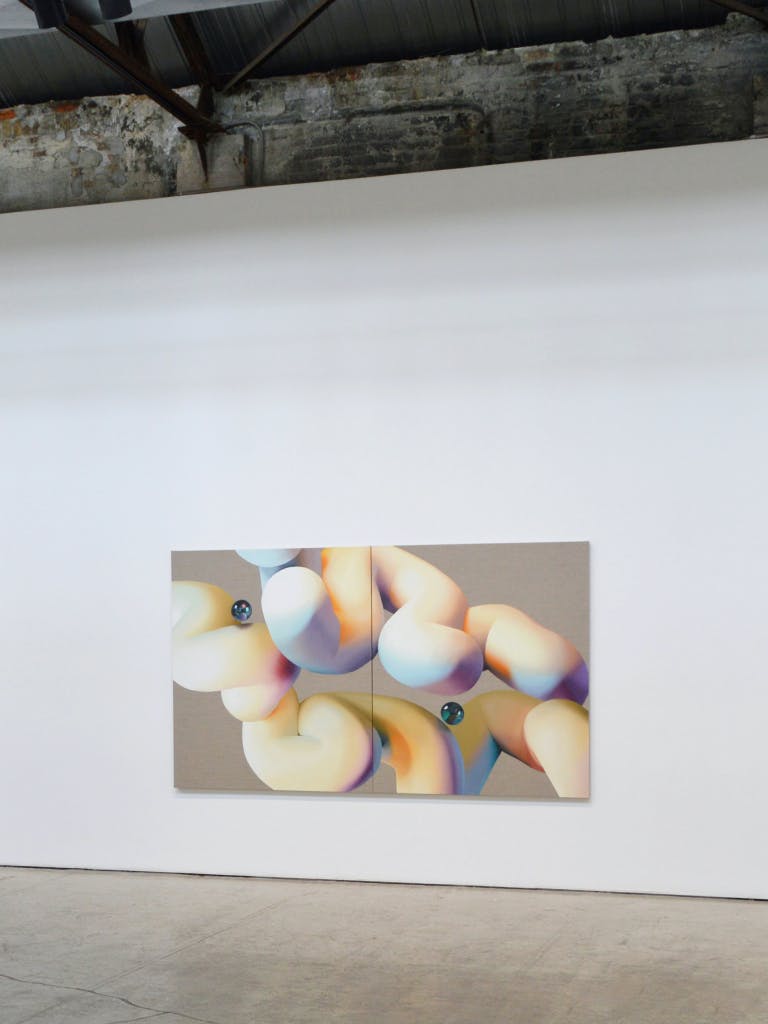 In a painting, Vainionpää positions the forms into place, and imagines a subtle motion in their fluid bends, allowing parts of them to fall off the edges of the canvas or wrap around other forms. In video format, the animated soft bodies retain the energy of movement as they intertwine with one another, as if they have come to life. The organic nature of this movement and interaction connects both handmade and computer processes to draw out a sort of biological feature that reminds us of our own humanness. We’re compelled to consider our relationship to imagery that feels slightly alien yet familiar, like a parallel interpretation of ourselves.