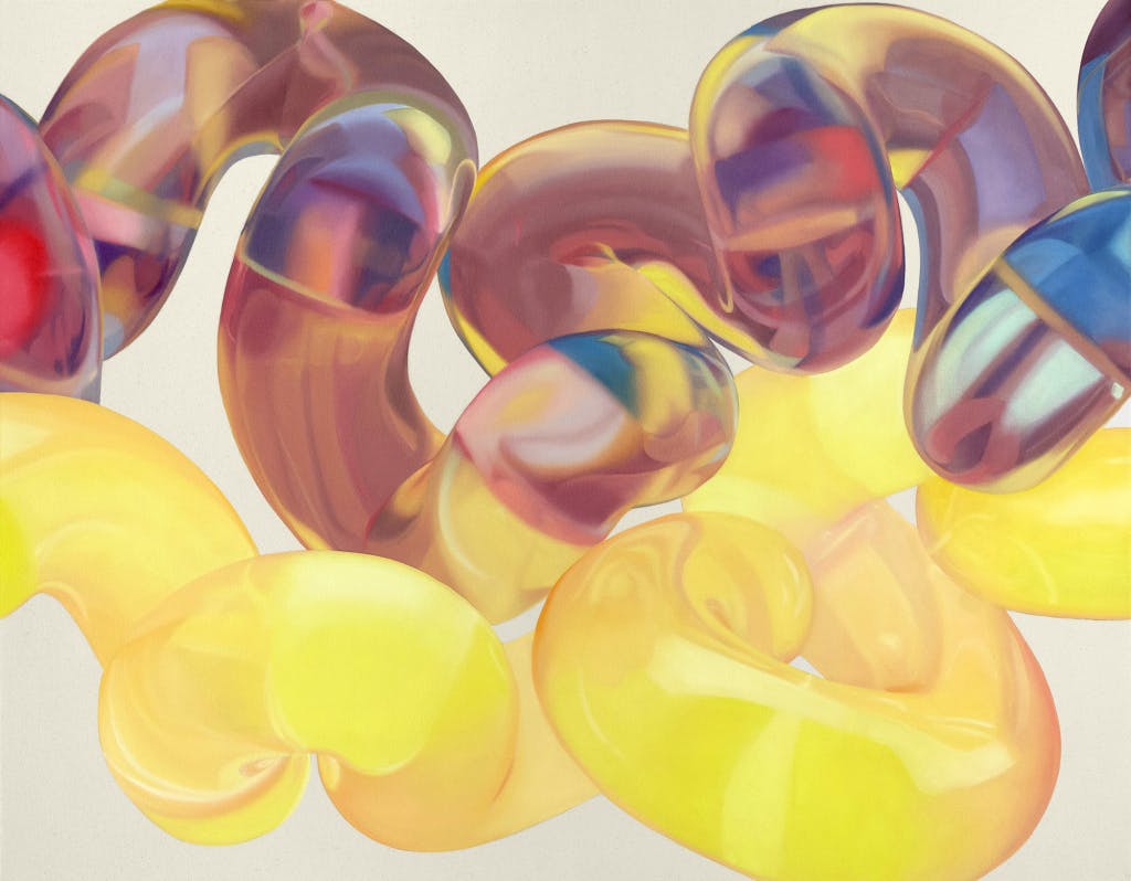 These graphics are produced with the help of a computer plugin that randomly plots points in 3D space, then automatically connects them, producing unique, curvilinear forms every time the script is run. Then, in the transfer of these instantaneously rendered digital forms to the canvas, a fluent sort of transcription process happens in the seamless switch from digital tools to a traditional paintbrush, toggling between 3D modelling effects and mixing pigments.