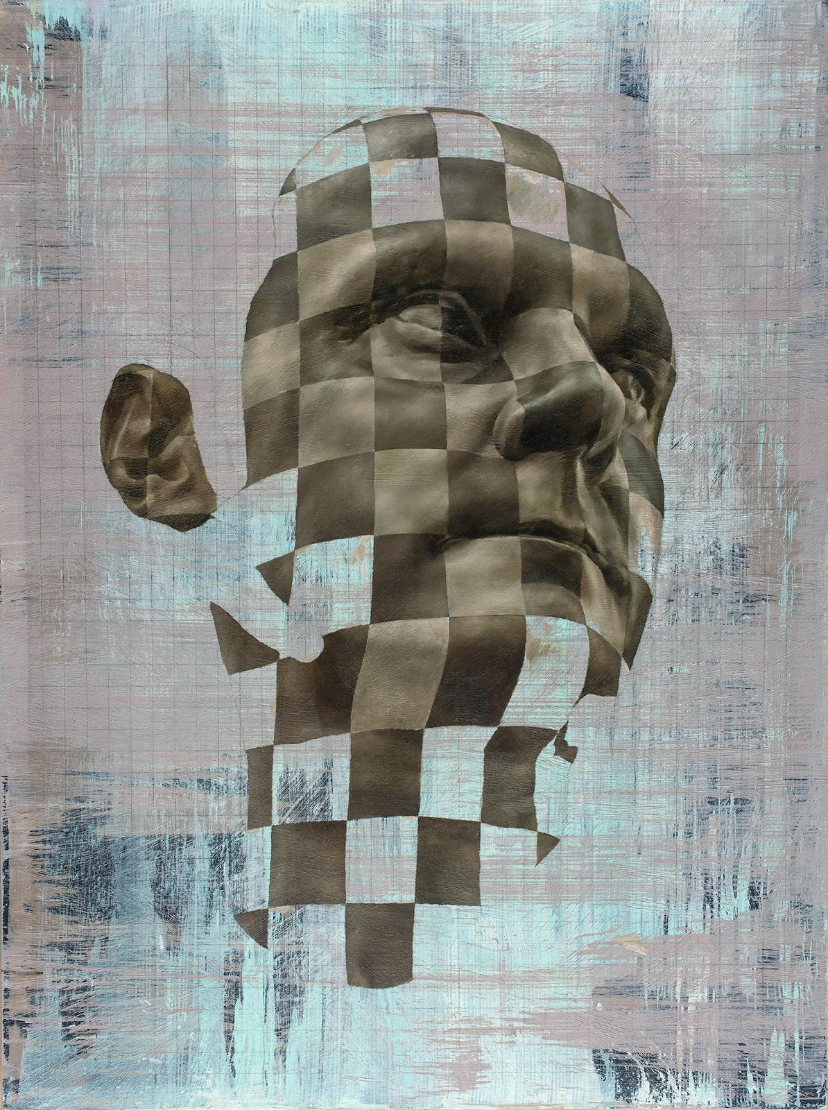The portrait painting within the work is purely imaginary and doesn’t exist in the real world, instead it was conjured up by a careful manipulation of digital files. However, the lines between real and virtual are blurred further by the fact the paint strokes used for this virtual portrait are themselves based on physical paintings.