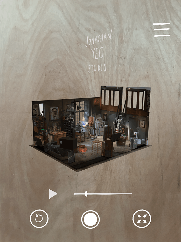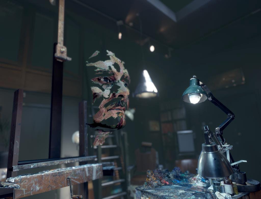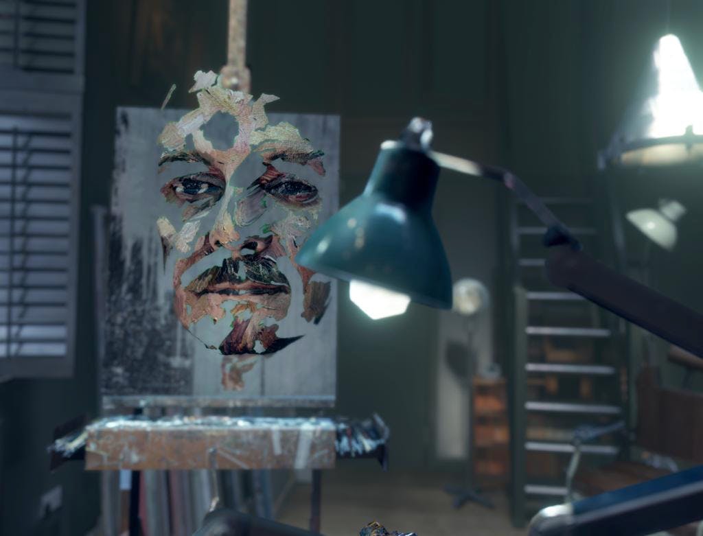 The process of turning 2D brushstrokes into 3D dimensions was an elaborate one. The artist first had to unwrap the textures around the 3D scan of his head in order to base his painting on it. Next, he painted brushstrokes on paper and photographed them individually before animating them against a greenscreen. Finally, Yeo brought the animated painting into the Unity game engine and projected it onto the 3D mesh. By placing both inside a photoreal model of his studio, and creating a moving camera viewpoint, it gives the impression of watching the painting process unfold in real life.