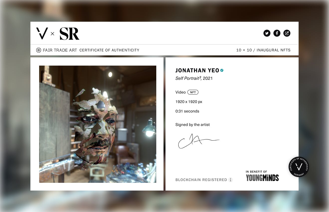 Jonathan Yeo’s NFT is certified with a Fair Trade Art Certificate from Verisart, an award-winning blockchain certification platform. Fair Trade Art is an initiative by Verisart designed to bring together artists and social impact organizations to do good. The certificate signals that funds from the sale of the artwork are benefiting a charitable cause. In this case, the artist will be donating 25% of his proceeds to Young Minds, a UK charity working to ensure young people get the mental health support they need.