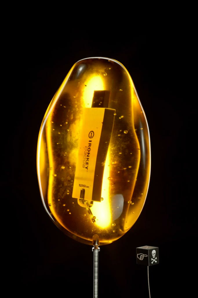 Polished yellow amber artifact containing an encrypted IronKey USB drive. The drive holds 7002
