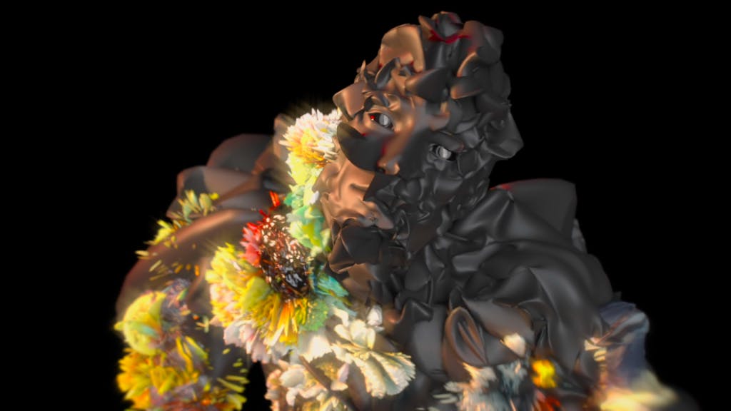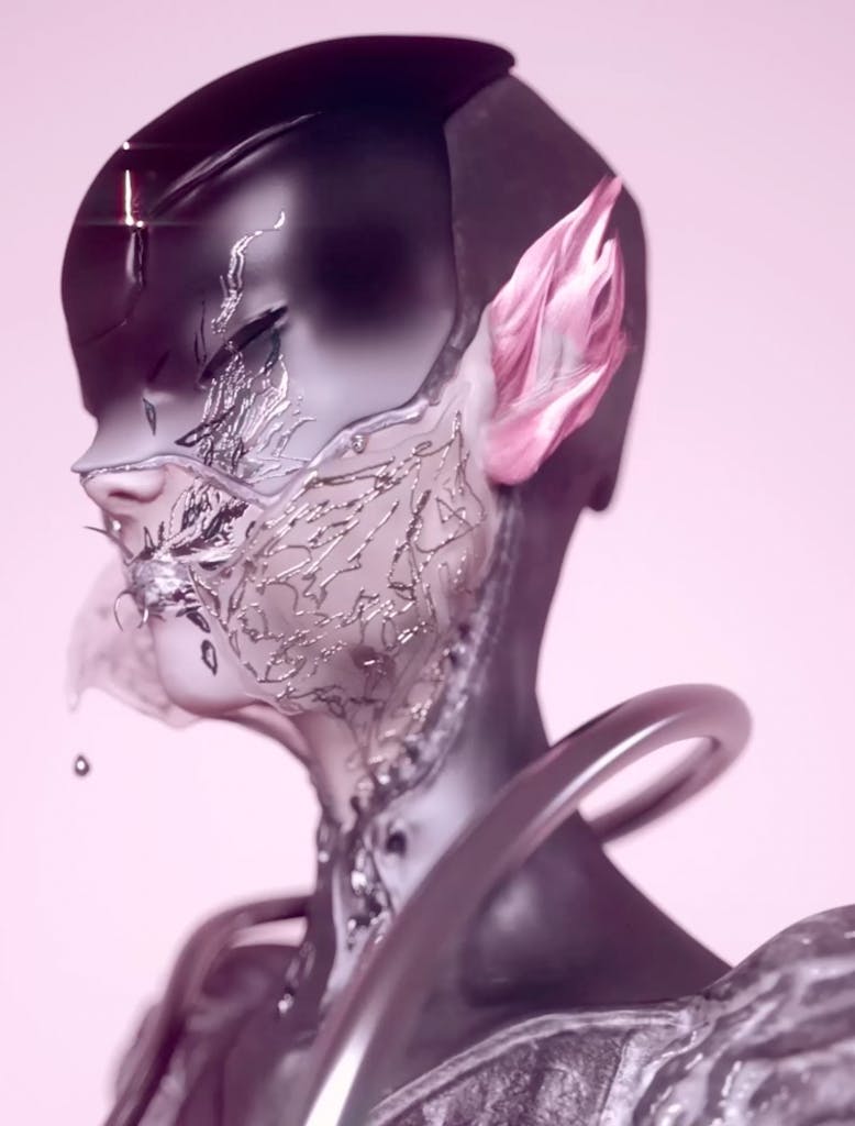 ‘Slow’ is a digital sculpture work with a material that emulates a combination of skin, fat, and porcelain. It depicts a figure dancing in crucifix with limbs morphing into ribbons. It belongs to a body of work called ‘Luna’ which also includes my music as Doon Kanda. All ecological impact of this piece will be continually calculated and offset.