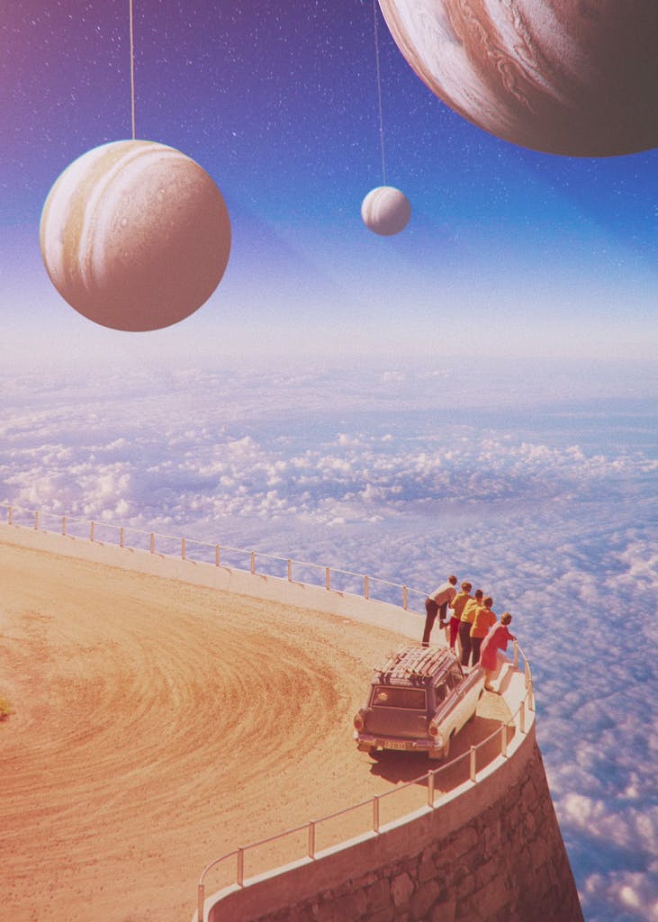 There’s nothing like stopping in the middle of the road and taking a look at the planets swaying in the wind.……………… By manipulating existing material, I seek to create new realities and tell new stories. | Created in After Effects & Photoshop | 1080×1080 | Joseba Elorza (a.k.a. MiraRuido). 2021.