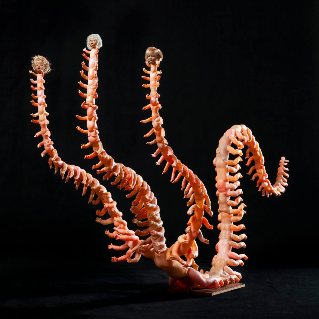 Jon Beinart will ship a small Toddlerpede doll sculpture to the winner of this auction. This is Jon Beinart’s largest Toddlerpede doll sculpture (2009) and was built with approximately 100 plastic baby dolls and a welded copper armature. The piece was significantly larger than the artist himself and was dismantled a few years after it’s creation. The doll parts were then reused to build other Toddlerpede sculptures. This photo was taken by Max Milne. Images of Jon’s Toddlerpedes were published in numerous art books and magazines over the years and frequently went viral online. Jon stumbled upon his Toddlerpede series by accident while messing around with plastic baby dolls. In 2002 he joined a few doll torsos together and noticed (to his delight) that they formed insect-like segments, and voilà, the infamous Toddlerpede was born. Jon found his creations adorable and hilarious and was initially surprised when people were offended and even shocked by them. Over the years, as his Toddlerpedes have spread all over the Internet, they have elicited strong reactions and have even been the subject of hate mail. Some people have found them endearing and amusing, while others have assumed that they are addressing issues, such as radiation and genetic mutation, or the subversion of childhood innocence. While Jon has enjoyed interpreting the unconscious meaning behind his Toddlerpedes and has even mused about their natural habitat and an alternate world in which they may have evolved, he prefers to leave them open to interpretation so that viewers can make up their own stories. Over the years, Jon’s Toddlerpedes evolved from small centipede- and scorpion-like creatures to complex hydra-like monstrosities with hundreds of doll torsos. The largest Toddlerpede was significantly larger than the artist himself. While Jon’s profile had grown with the notoriety of his Toddlerpedes, images of them were frequently shared online with no credit, so most people who encountered Toddlerpedes had no idea who had created them. While this bothered Jon at the beginning, he gradually came to accept that his babies had grown up and left home and had taken on a life of their own. Jon created his last Toddlerpede sculpture in 2011 and decided to move on and dedicate more time to drawing and painting.