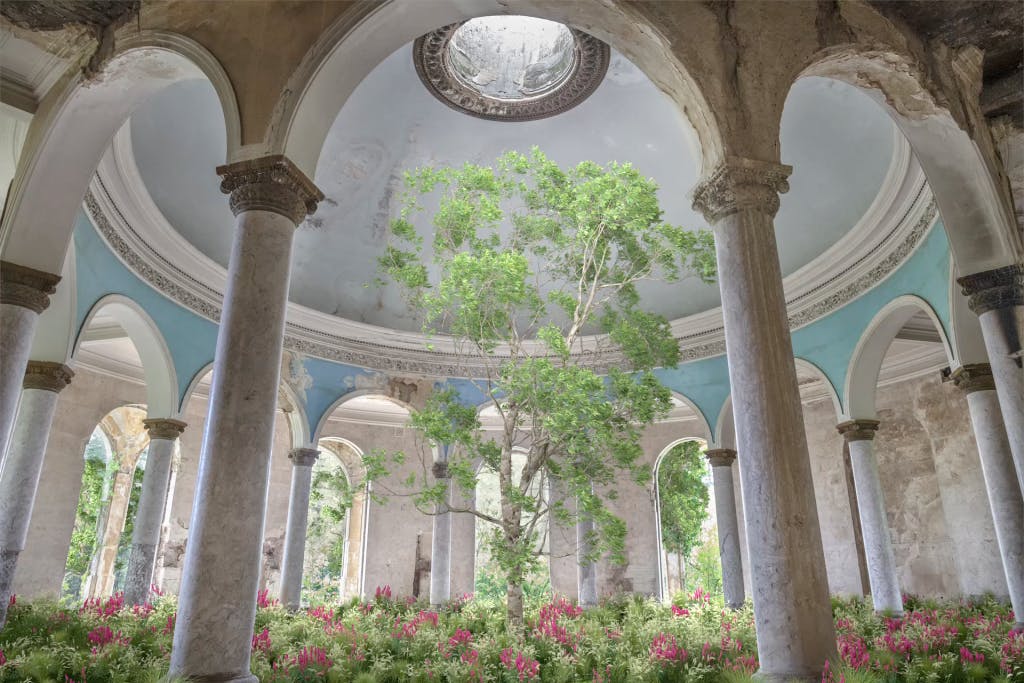 ‘Eternity’ is a piece from the series ‘The Wild Within’ by Ryan Koopmans and Alice Wexell. Based on real-world physical spaces, an animated rebirth into a digital realm has been created. During the Soviet Union, the Georgian town of Tskaltubo was a popular health destination famed for its therapeutic water and luxurious sanatoriums. Between the 1940’s to 1980’s thousands of people visited, including Stalin and his high-ranking officials from Moscow. When the Soviet Union collapsed, the buildings were deserted and fell into disrepair. Since the early 90’s, they have been slowly dismantled and stripped of their valuable materials, leaving empty shells of what were once grandiose classical structures. Koopmans visited this region over several years, exploring the ruins and photographing the spaces. Upon returning, in collaboration with Alice Wexell, they digitally introduced vegetation, manipulated the lighting and structure, added sound by Ross K, and animated the scenes with the intention of reviving the empty spaces, essentially bringing life back into the rooms. The results are a surreal collision between the past and future, as well as the physical and digital worlds. Some of the buildings depicted in this project have been demolished in recent months, further emphasizing the theme of time passing in the cycle of growth and decay.