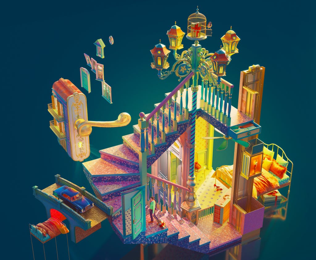 Daydream represents a stream of consciousness that detaches from life. With everything that’s been going on in the world this last year I wanted to create a space that promotes relaxation and comfort. The dawn lighting of a summers day and the floral like pillows act as something to encourage positivity. I hope you can spend time with this piece. Looking at different areas and noticing the small details and compositions, just taking some time to pause and focus on something beautiful.