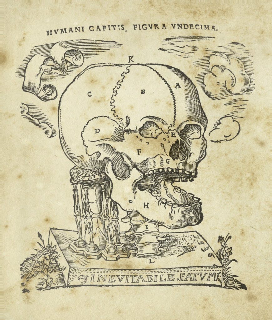 Churning clouds presage something dreadful. In an orbit of stains and smudges, a human skull is separated from its body and is faced with the impossibility of its situation. It rests on an hourglass, overlooking the fall of the last grains of sand. A gaping mouth and twisting face release a silent and continual wail.