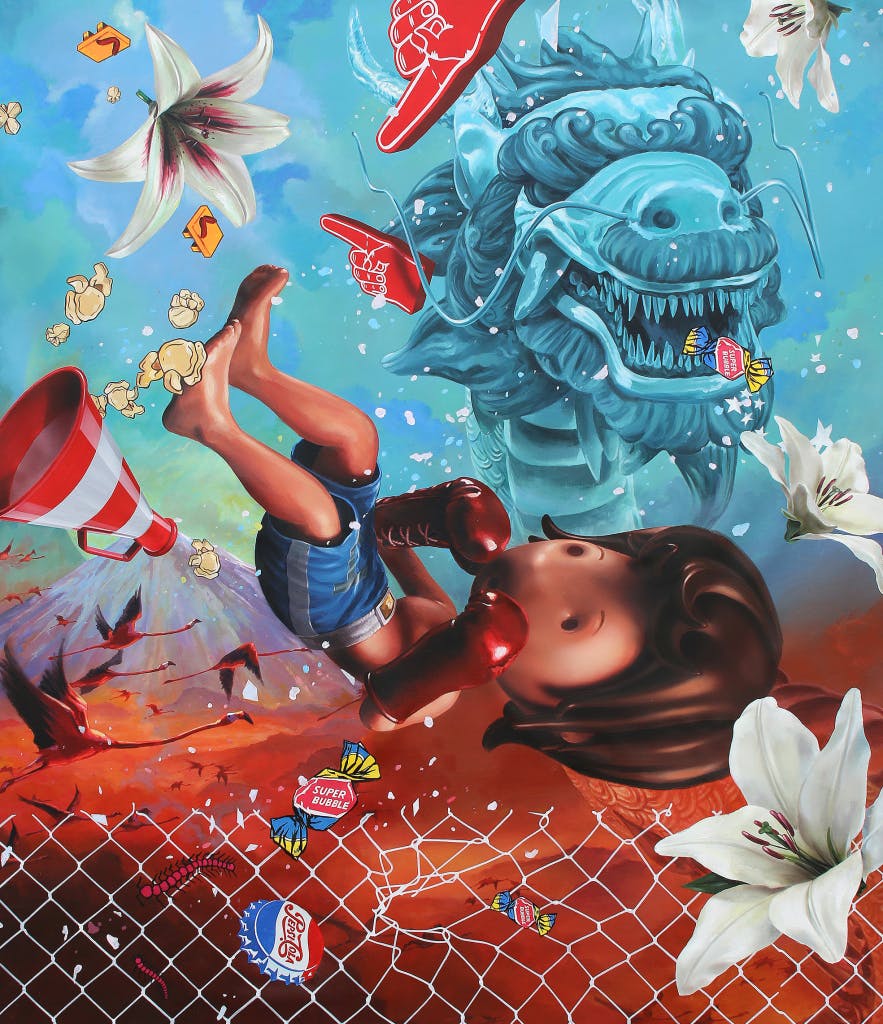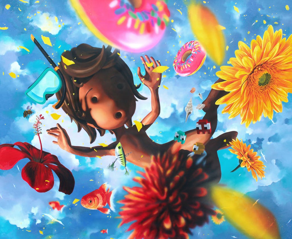 With the exception of the painting entitled To be continued, in which the figure of the child is rendered with a realistic and mimetic language, the artist’s canvases show Jonny as a sort of abstract construct, like a synthetic identity, general but still customizable, designed to assume manifold aspects. In Giovanni Motta’s paintings, Jonny is a hanging, fluctuating, changing entity, who attracts in his vortex a plethora of objects, complements, appendices of his personality which reveal his tastes and passions, desires and aspirations. Jonny never touches the ground, he flies, like the virtual cowboys of William Gibson’s cyberpunk mythology, like the other Johnny, the Mnemonic, but his goal is not to break the excessive power of multinational corporations, it is to perpetuate the dimension of the game or, better, the enthusiastic experience of pleasure, whether it is linked to an object, a food, a toy, a videogame character. Also “enthusiasm” is a word deriving from ancient Greek (enthusiasmós), which means “possessed by god’s essence”, “divine obsession”. It does not indicate a simple mood, a breath of emotional participation, but rather a contagious, cheerful, overwhelming, active force which, in conclusion, allows to overcome every obstacle and to realize one’s dreams. Motta looks for the enthusiasmós which animates the inner child, he materializes it, he gives it a plastic and pictorial substance, simply because images are powerful attractors, a thousand times more efficient than words.