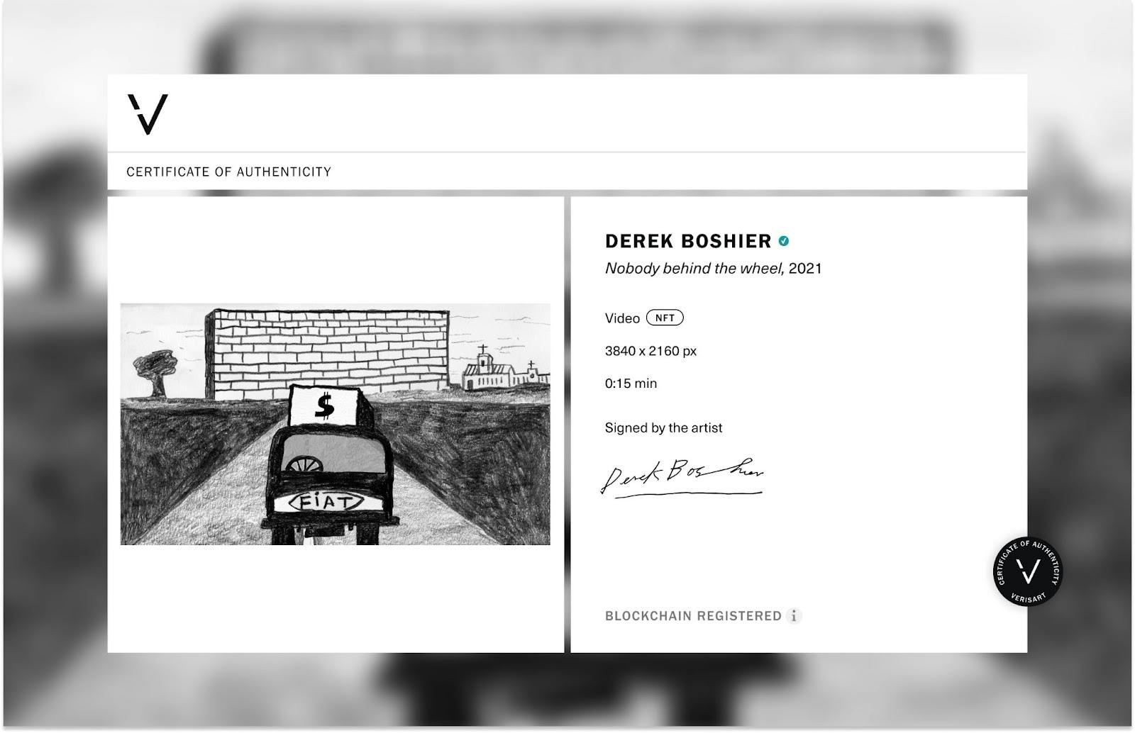 Derek Boshier’s inaugural NFT is certified by Verisart, an award-winning blockchain certification platform. Designed to empower artists to tell the story of their work, the digital certificates include additional images, videos and documents. For collectors, Verisart’s patent-pending Certificates of Authenticity (COA) form an integral part of collecting NFTs. They provide confidence in the identity of the artist and the verified history of the artwork. Through the certificate, the collector of the work will gain exclusive access to the original animation for the Nobody Behind the Wheel video.