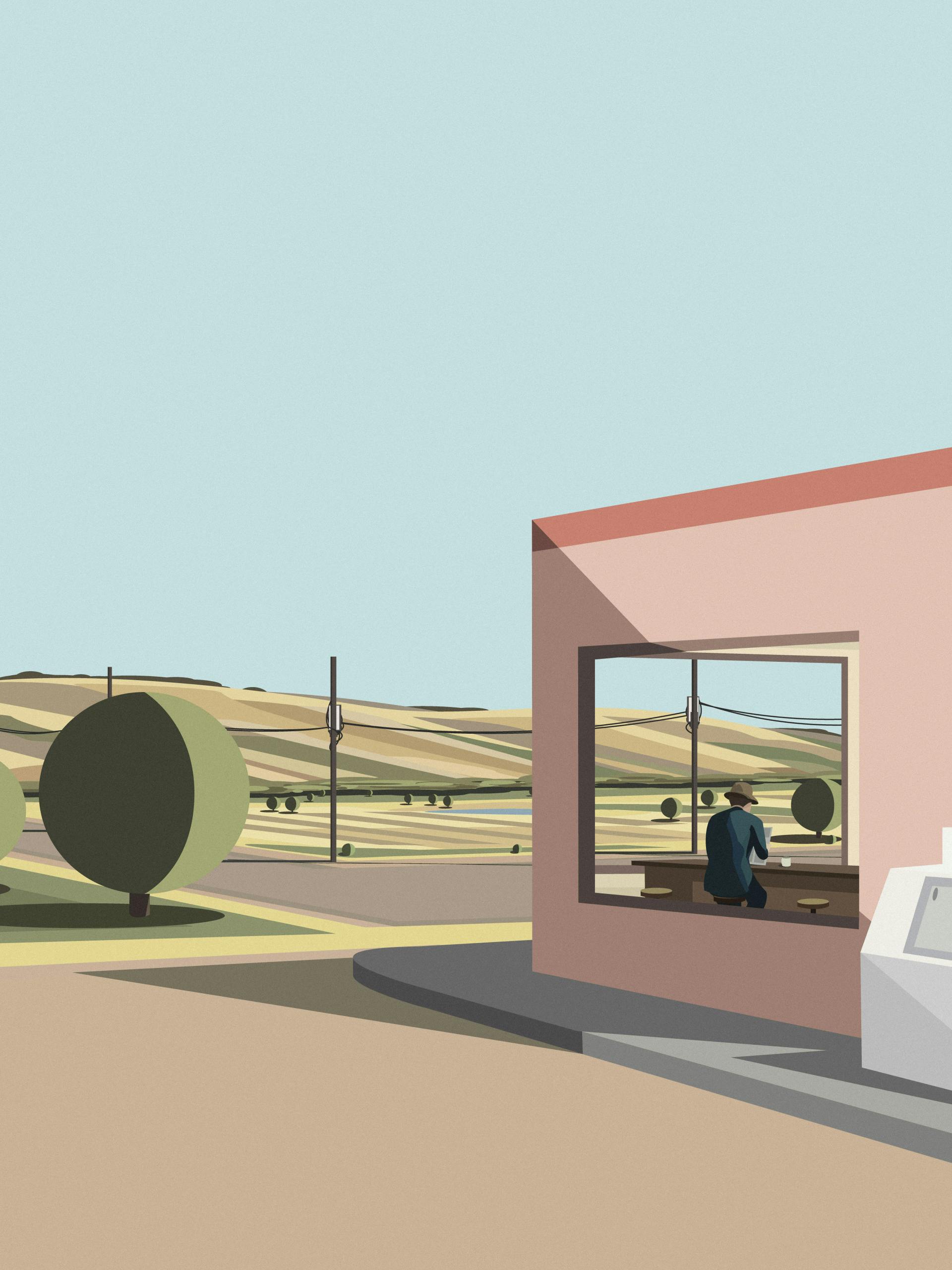 I find it quite funny that people often compare my art to that of Edward Hopper’s and other American Realist painters of the 20th century. Only after I started my “Midwest” series did I begin to look at Hopper’s work. It was heartwarming to know that my vision for art shares similar themes as many artists who have come before me. I think of it a little like convergent evolution. However, once I began illustrating minimal landscapes, I wanted to re-explore these particular art genres that artists such as Hopper or Grant Wood popularized. American Regionalism and American Realism are now two of my favorite genres of art. As I continue to create, I hope to showcase the digital space my interpretations of these particular genres.