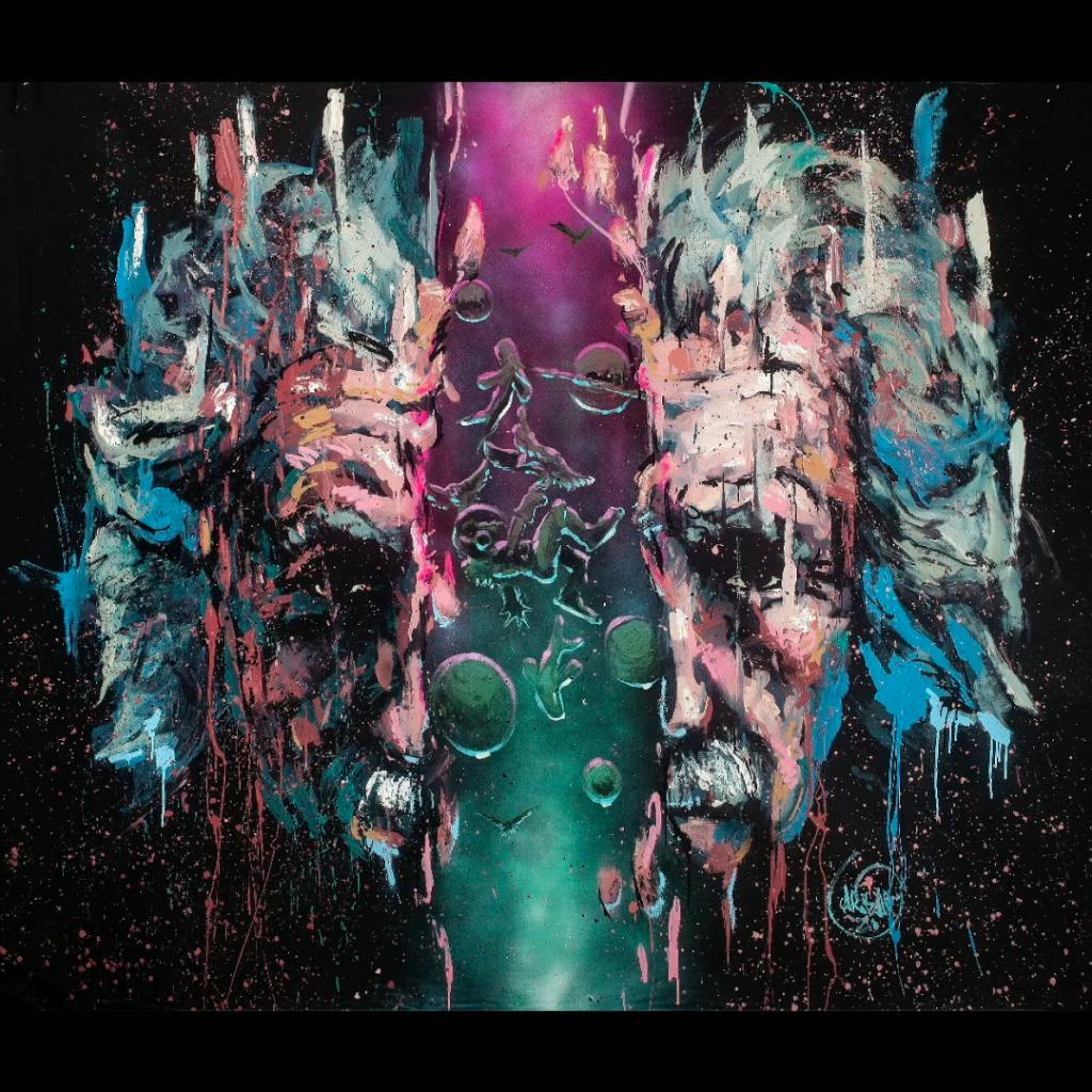 For the past 18 years I’ve focused on performing portraits live all while making the process entertaining and a high quality finished product. I’ve always wondered what it would look like if we dived into the mind of these icons. I started developing my newest collection “Out of Mind” in early 2021, and this Einstein inspired image was one of the first. It was experimental, but also intentional about where I wanted to go. This painting spurred on a collection of now over 20 plus images in this style. The title “Theory of Imagination” is