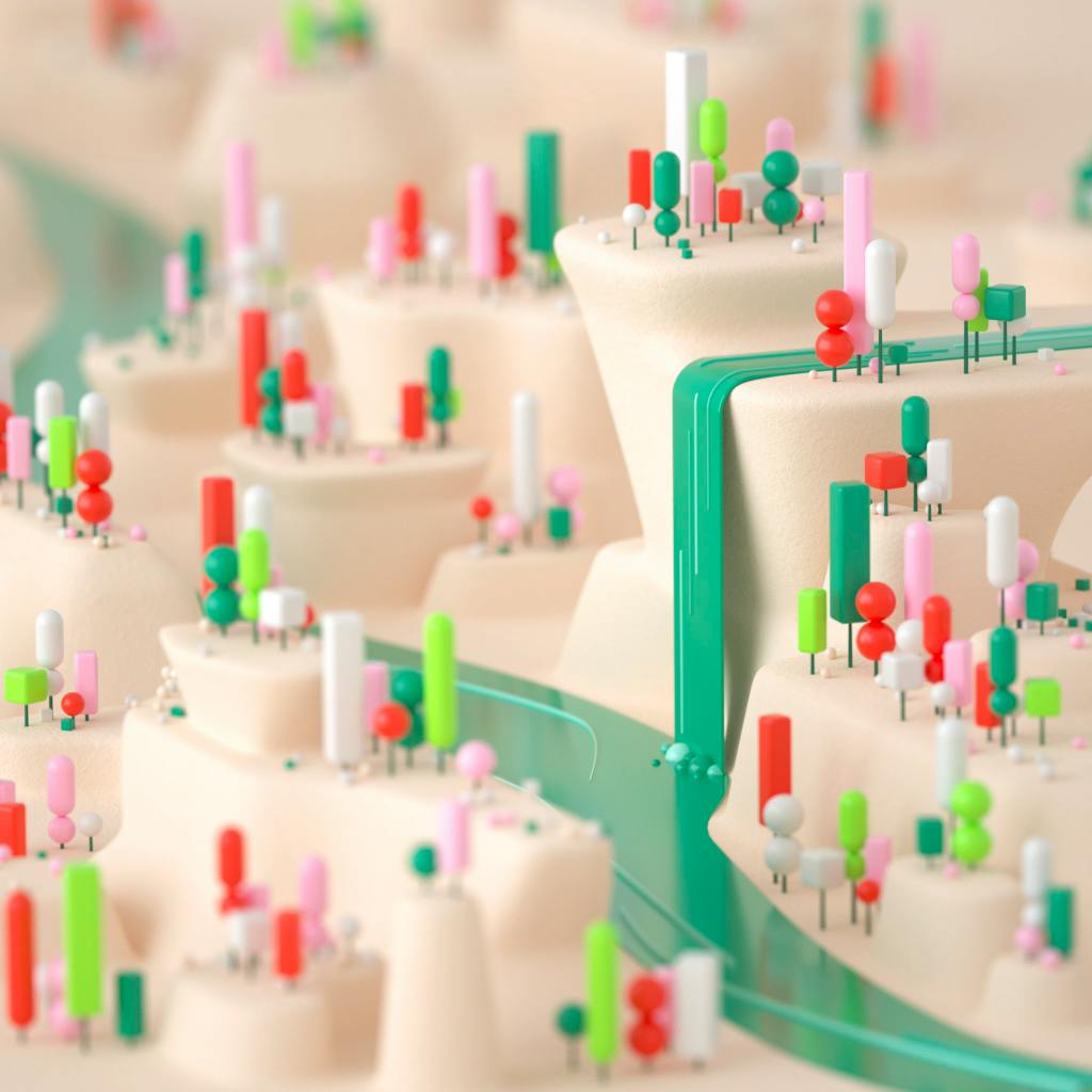 2048 x 2048px. 10 second loop. This little green river is rumored to contain tiny pink fish that exist exclusively to hug one another. A remastered work from the “Colorful Nature Exploration” series. Artwork created by Chris Guyot.