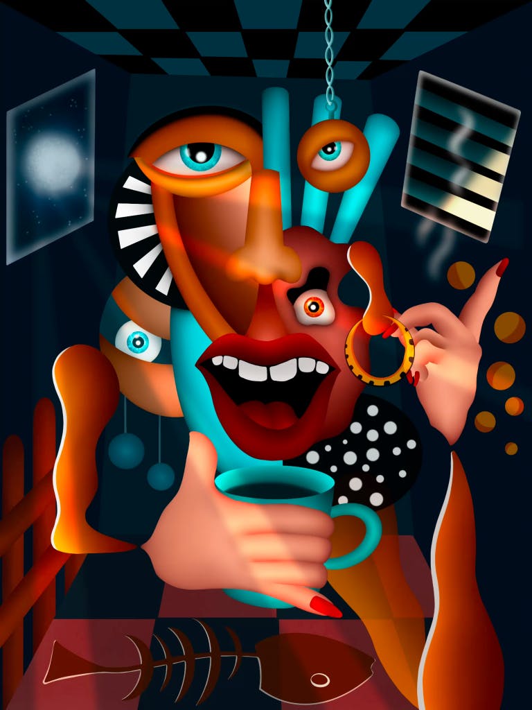 This is the most important illustration of the series “Tales of Brave Angels”. It represents mainly my person and everything that belongs to me but in general the commonplace of all artists in which creative ideas are born and visions and desires are realized. This image contains the main worlds I live in: 3d graphics (CGI and VFX), music, photography and videography, freerunning/acrobatics, and painting. The blank canvases represent the future, the works we will create, and the projects in which we will participate. The canvases at the bottom left are paintings actually created by me in the past years as well as the painting in the center. On the left, there’s my pc setup and in the monitors, you can see the work in progress of this illustration. On the right, my music world, I play guitar and experiment with keys + the monitor with Ableton interface with a screenshot of my last single as Luxyum. Every single piece of this whole situation has got its specific meaning. Size: 8000×7000 p