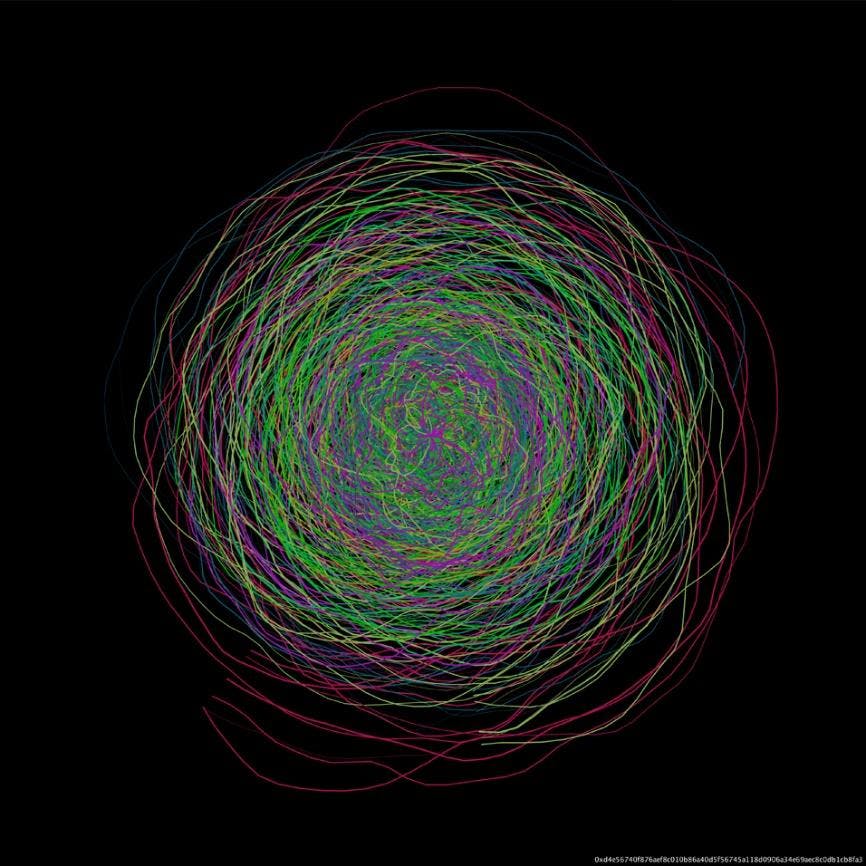 A hash is basically the reference number of a block in a blockchain. Hex6c has developed a way to map any hash “into a unique coilgram made of intertwined coils with different shapes and colors. Hashes are used as random number generators to determine the shape and color of the coils.” ‘Genesis Block’ is a coiled representation of the Genesis block of the Ethereum blockchain.