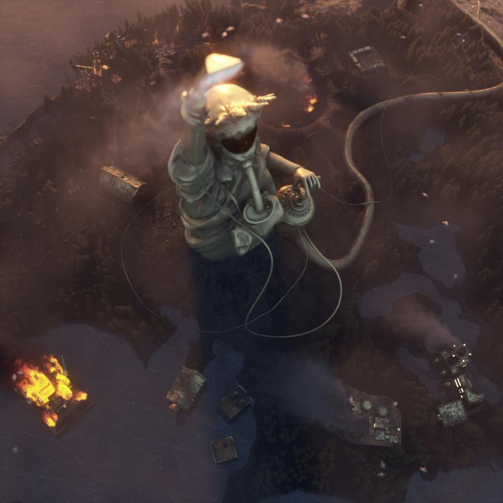 The landscape surrounding these sites is created with dark colors, emphasizing the destructive impact these events had on the environment.