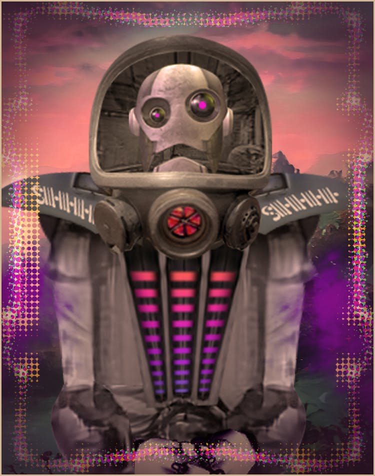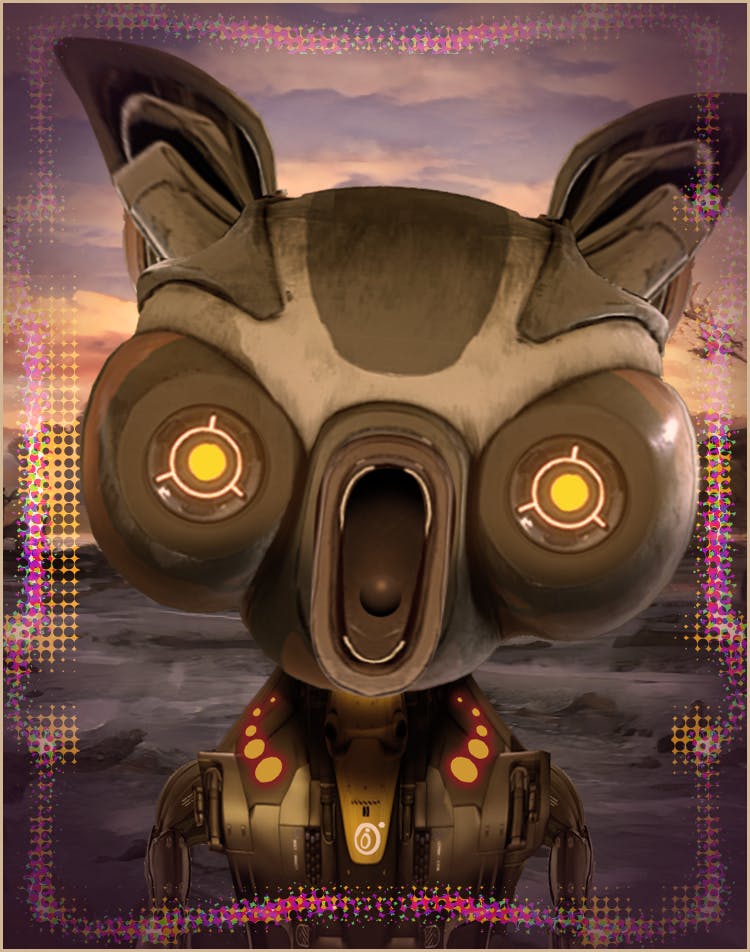 MeeVee is a reconnaissance robot that tried to commit suicide by electrocution but instead entered an alternative state where they were visited by the great Golden Toaster.