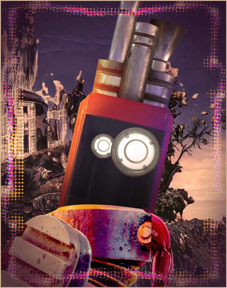 Mopomenter was a gaming console in an arcade that had a knack for poetry. Unable to express themselves stuck in an arcade, Mopomenter began to write poetry in the high score boards of the games they housed. Discovered one day by a fellow Robot they were stolen and taken to the shrine.
