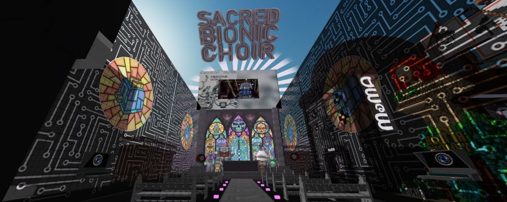 Sacred Bionic Choir the NFT will be released on Super Rare just prior to the Crypto Voxels event. The piece includes full commercial rights to the music and is Alotta Money’s first ever audio visual NFT.