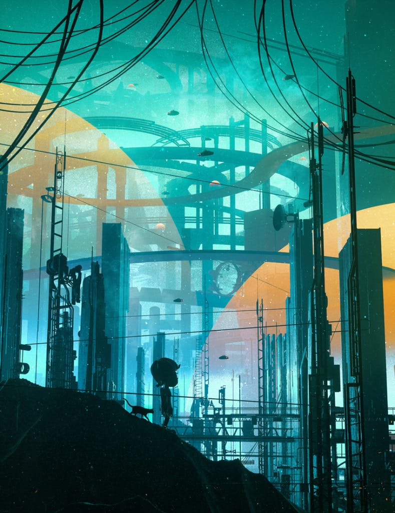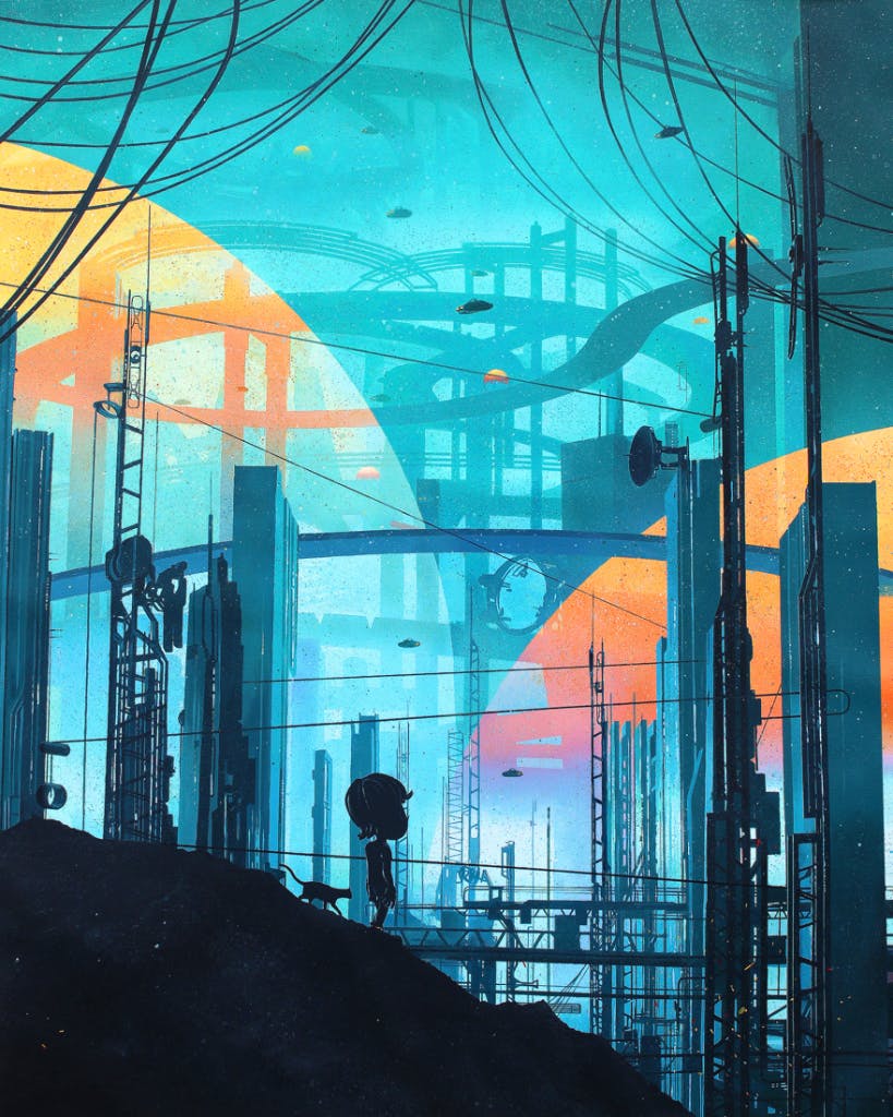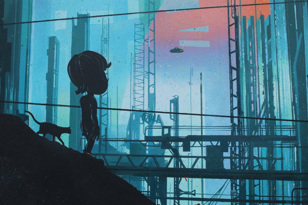 What does a dream look like? Maybe like an industrial conglomerate, a hypertrophic megalopolis cut through by the windy spiral of viaducts and rectilinear motorways. Maybe like the image of a child and a cat crossing the ruins of endless suburbs. Maybe, if we believe hard enough, it looks like a wrecked world, all to be rebuilt, a world still covered in rubble and junk, but in which we finally do not feel alone anymore.