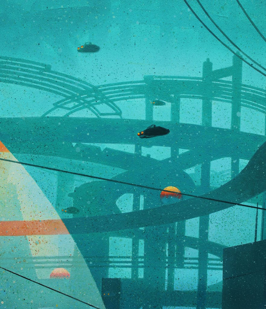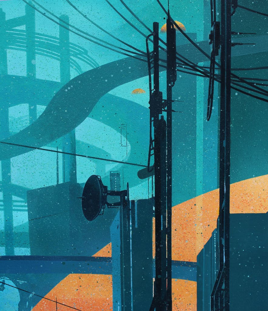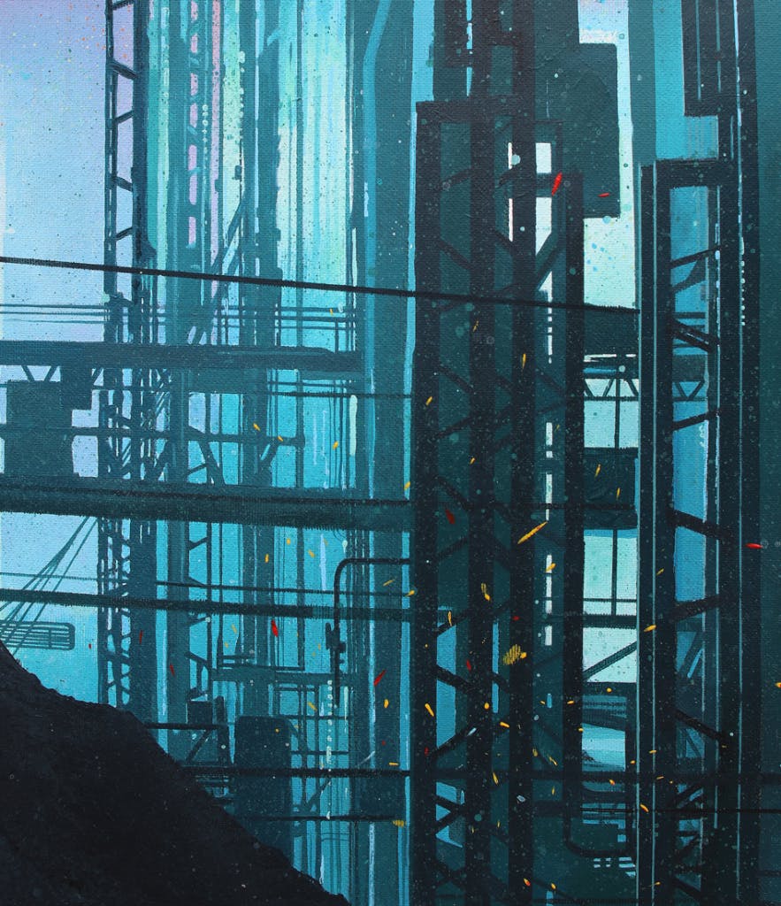 While in Dangiuz’s cyberpunk universe the individuals face the monstrous and fascinating architectonic immensity of a dying civilization, just like the Wanderer above the Sea of Fog