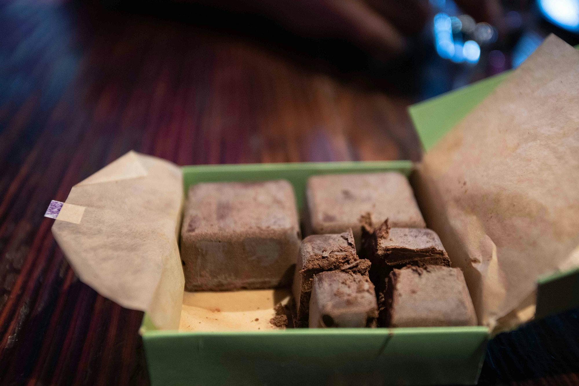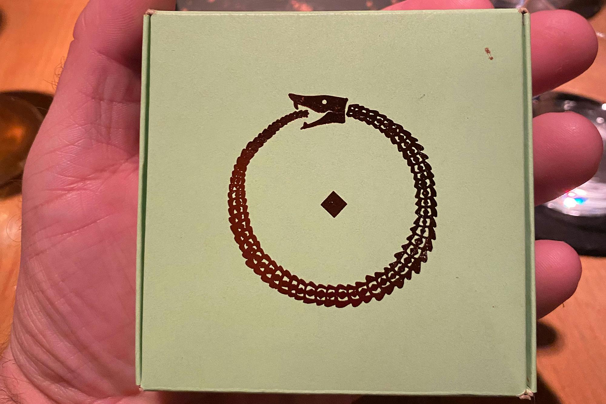He has with him a small green box labeled with a serpent eating its tail. Inside is a block of psychedelic mushroom-infused chocolate. We all indulge.
