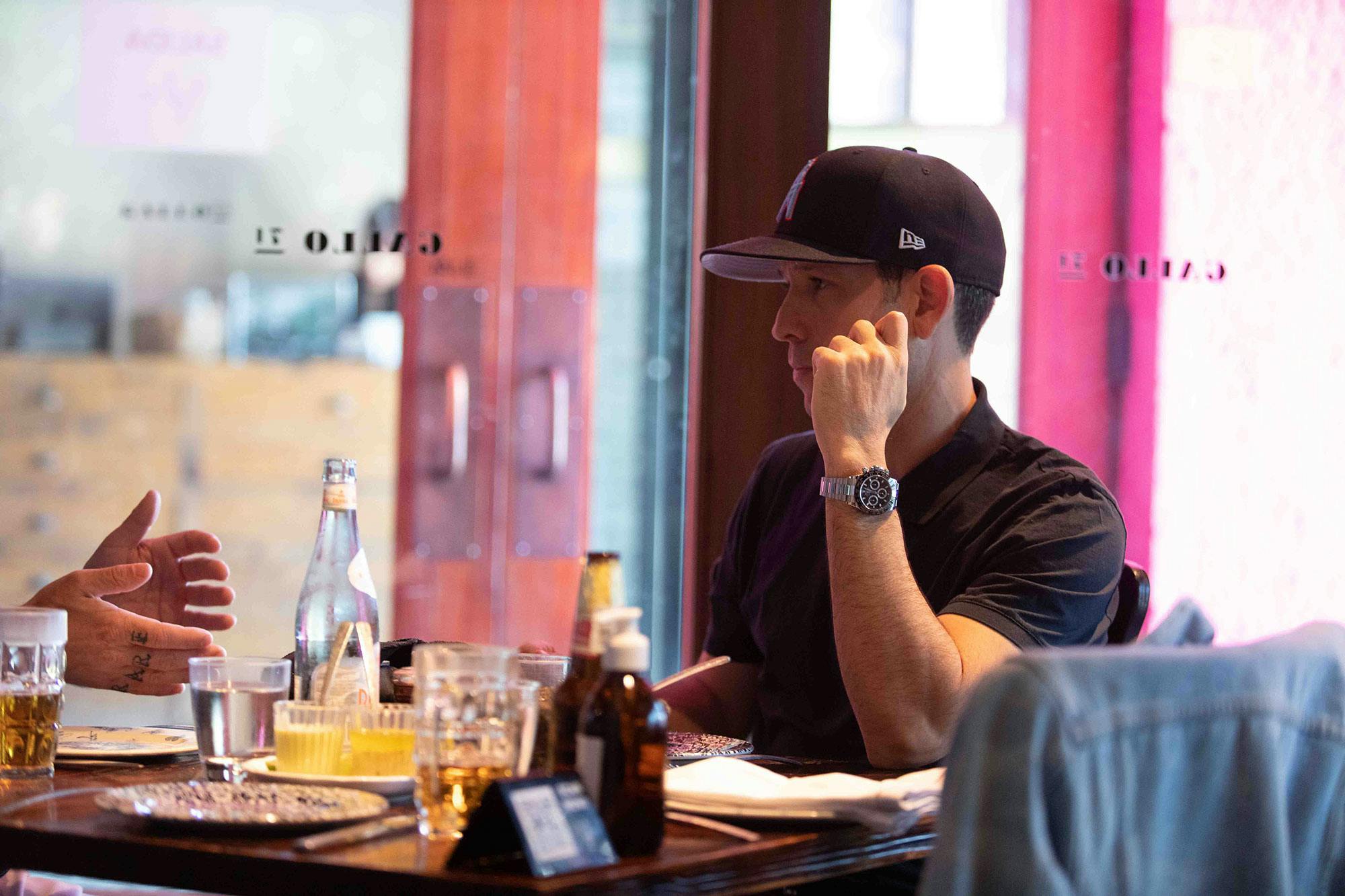 It’s 7PM before Nain and I have dropped our bags at the hotel and walked across the street to meet Gabriel Santos Elizondo, or Gabe, at an upscale Japanese restaurant. Clean shaven and fit in an Astros cap, large silver watch, and denim coat, Gabriel is dressed like a baseball fan who can afford box seats. He sits alone in the amber glow of the back patio and greets us with enthusiasm.