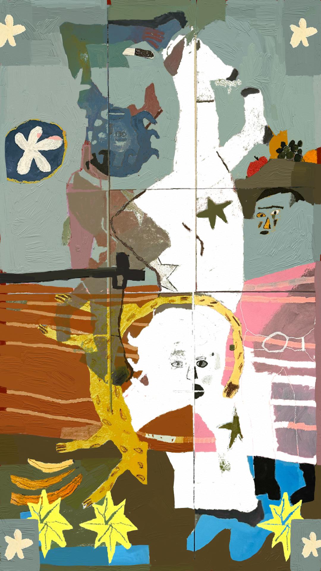 Acrylic and ink on 12" x 6" wood panel, digitally edited. 2024. Original painting included for free with sale at collector's request.